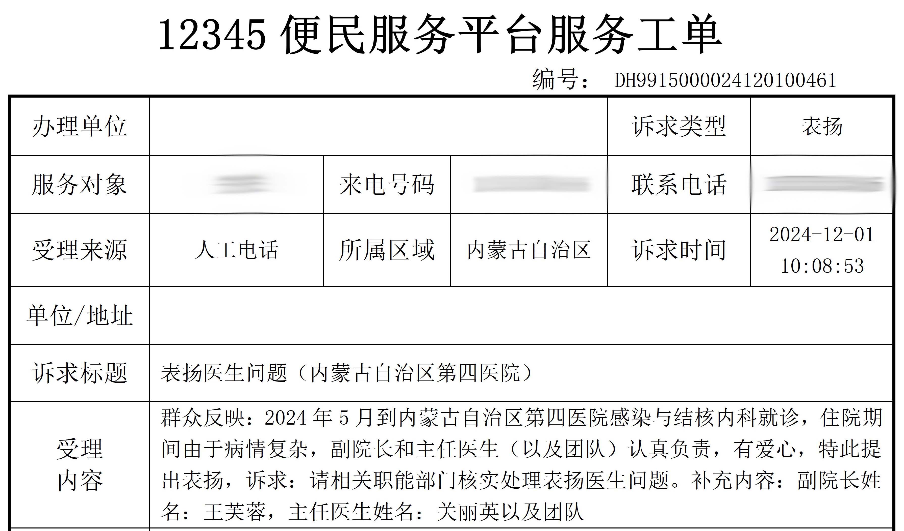 2024年12月2日,内蒙古自治区第四医院(胸科医院)收到了一封来自12345政务服务便民热线的表扬工单。