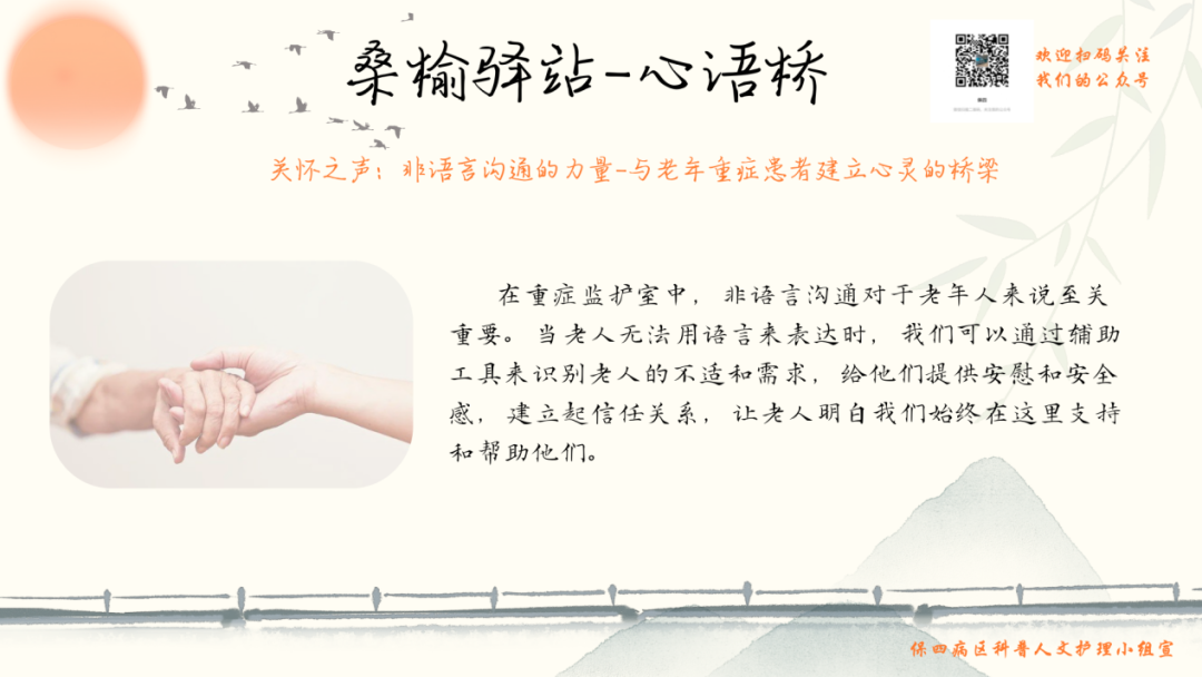根据国家卫生健康委、国家中医药管理局印发的《进一步改善护理服务行动计划2023-2025年》精神,进一步深入贯彻落实医院党委号召的“假如我是一名患者”党员实践活动,本着一切服务于病人的宗旨,为病人提供优质,满意的护理服务,营造舒适的就医环境,不断提升护理质量,老年医学中心四病区老年重症监护室创建“一科一品”护理品牌系列活动,创建非语言沟通区-心语桥。