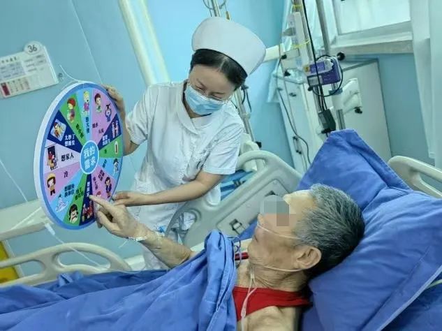 在日常交流中我们常常会通过语言、文字、视频等方式来沟通交流,清楚表达自己的需求,而这简单的需求,在老年ICU 的患者中似乎很难实现。ICU患者大多因病情或插管治疗导致暂时失语或无法用语言表达自己的需求。往往不能言语,为了更好的“聆听”患者需求,针对这类患者,我们特别制作了图文并茂的图版,每一张都是一幅生动形象的卡通画,供患者指认选择,有效提高了沟通效率。若卡片上的文字未能精准表达患者需求,科室还备有写字板,让有书写能力的患者自行写出自己的想法,为语言交流障碍患者提供无障碍沟通服务。