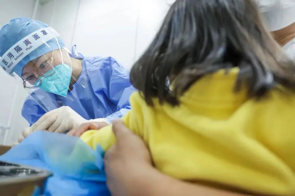 5月9日,北京协和医院急诊科发热门诊护士为一个儿童采指血。新华社记者张玉薇 摄