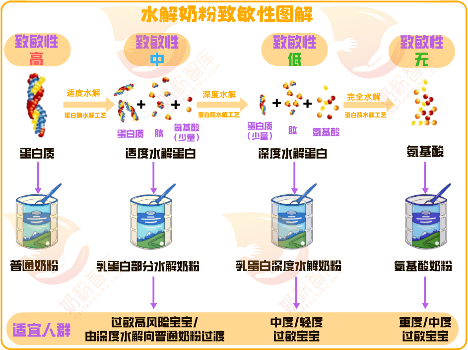 氨基酸奶不含肽段、完全由游离氨基酸按一定配比制成,不具有免疫原性,超过95%的CMPA患儿可耐受。但氨基酸奶价格较高,所以首选深度水解奶,无效再选择氨基酸奶。